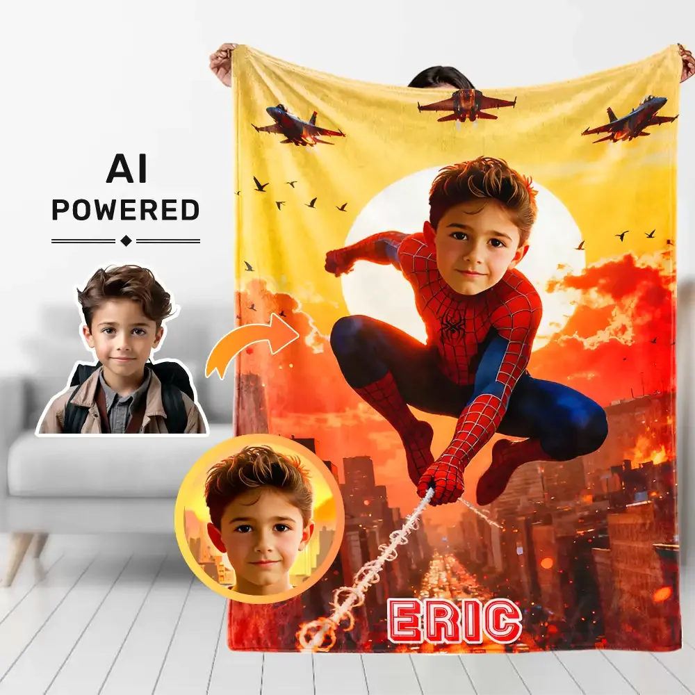 Custom Blanket AI Powered Yellow & Orange Superboy Sunset City Adventure Airplanes Children's Day Gift for Boy