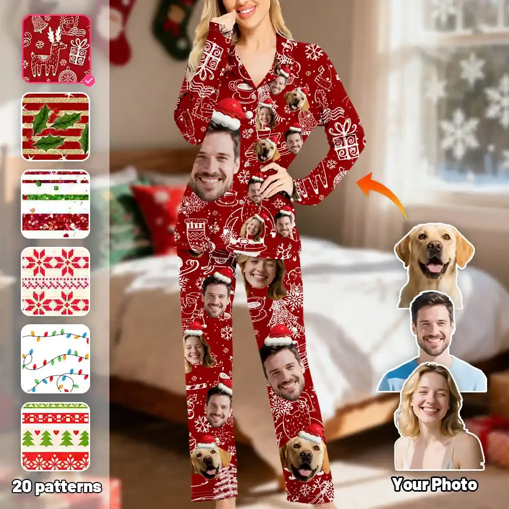 Custom Christmas Pajamas Long Sleeve Pajamas Red Base Hand-Painted Style Stripe Christmas Gift for Her